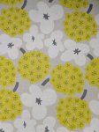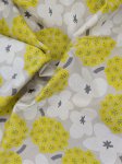 Clustered floral print on a natural ground featuring soft white blossoms, chartreuse yellow florals, and gray details. Light contrast with a graphic layout. Printed on an 85% cotton, 15% linen blend with light structure. Suitable for dresses, skirts, tops, and lightweight jackets.